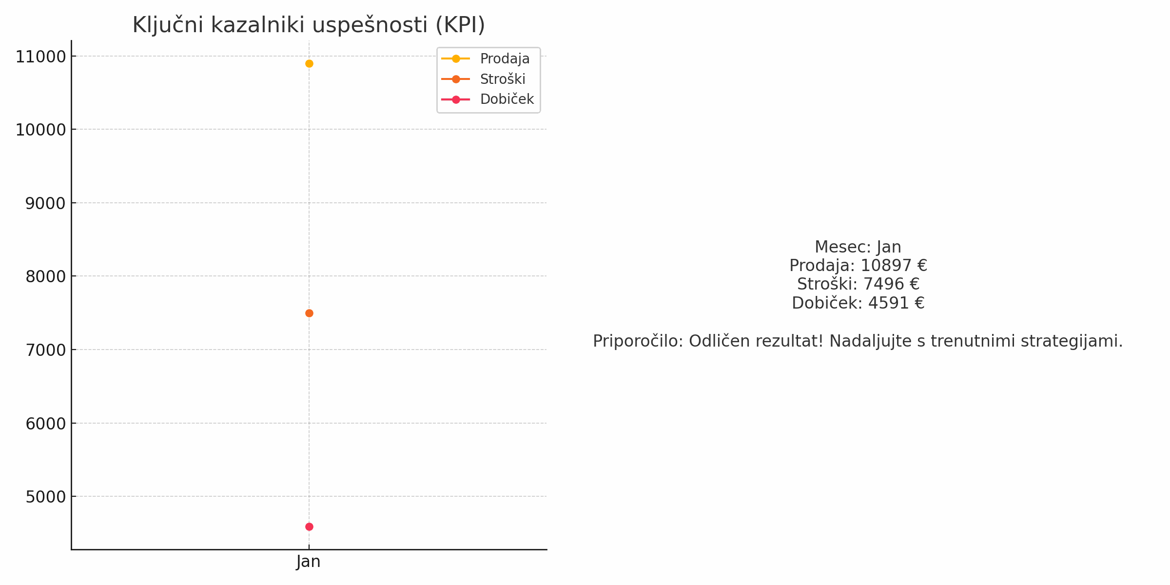 Primer avtomatiziranega poročila s ključnimi kazalniki, grafi o uspešnosti ter samodejno generiranimi povzetki in priporočili.